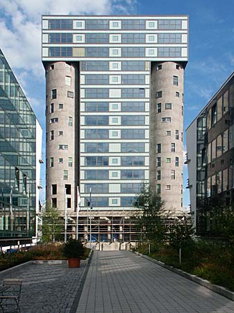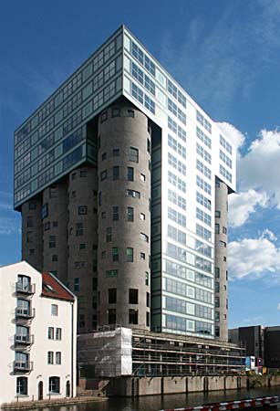 In seiner Architektur soll dieses Gebäude eine Brücke schlagen zwischen Gestern und Heute, zwischen Vergangenem und Zukunft, zwischen der Romantik eines historischen Hafens und dem Buisiness von heute.